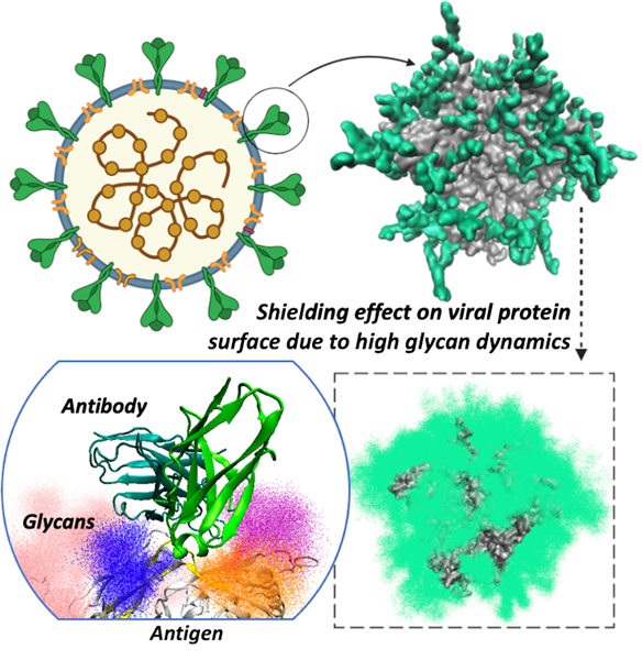 The human immune system is generally adept at detecting and combating foreign invaders. However, enveloped viruses such as HIV, influenza, SARS-CoV-2, and Ebola among others, have evolved a clever strategy to evade it. The proteins expressed on the surfaces of these viruses are cloaked in a protective layer of complex sugars called glycans. This “glycan shield” acts as camouflage, literally, a sugar coating, for hiding the virus’s more vulnerable protein regions from the host’s immune system[1]. Understanding how this shield works—and finding its weak points—is a major focus of biophysical research, with the goal of designing better vaccines and therapies.