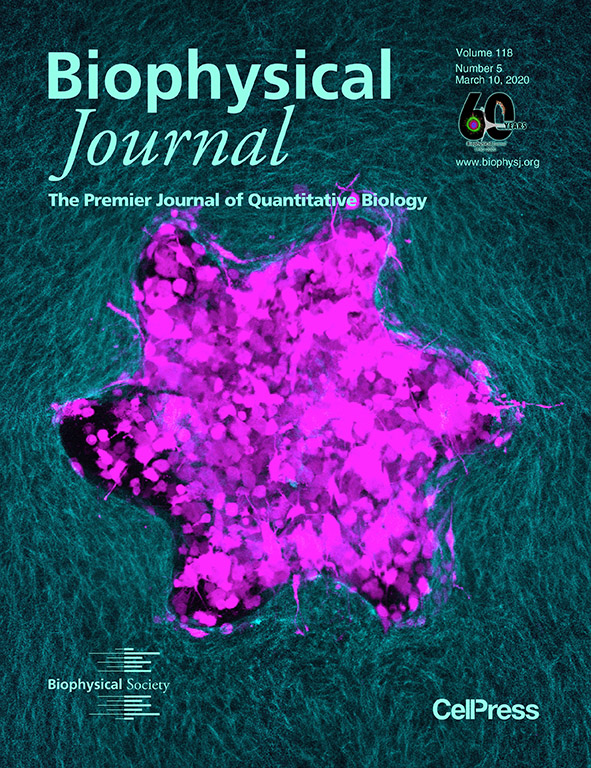 Tumors: The Stars of Cancer Study Solid cancer tumors grow into various shapes. These shapes primarily arise from the unregulated proliferation of cells and are often cited as metrics to gauge the prognosis of the disease. However, growth is only the beginning of the lethal journey of a tumor. While more than 90% of cancer-related death is caused by metastasis, it is unclear how tumor geometry modulates the dissemination of cancer cells. To investigate this problem, we combine experimental measurements and computational modeling to study the dissemination of tumors in the 3-D extracellular matrix (ECM). We find that the tumor geometry and its rate of dissemination are indeed closely related via a mechanical feedback mechanism. Tumor shape determines the collective ECM remodeling by cell-generated forces while the micromechanics of the remodeled ECM regulate the migration and force generation of tumor cells. The cover image of the March 10 issue of Biophysical Journal is a two-channel confocal slice of a star-shaped tumor at the onset of invasion into the surrounding ECM. Here the ECM consists of FITC-conjugated type I collagen matrix, and the tumor is a cluster of fluorescently labeled MDA-MB-231 cells. The initially random alignment of the collagen fibers is reconfigured by cell spreading and contraction after the cells are seeded. The cell cluster is fully enclosed in a 3-D collagen matrix. Cells at the boundary have extended long protrusions into the collagen matrix. Both the cover image and our research highlight the importance of physical interactions in cancer metastasis. Our tissue is mechanically reconfigurable, which means it can be exploited by tumors to facilitate their growth and invasion. It also offers us opportunities to curb the progression of this deadly disease. We hope this largely unexplored research field can attract more interdisciplinary research, eventually leading to complimentary therapeutic options to cancer patients. —Jihan Kim, Yu Zheng, Amani Alobaidi, Hanqing Nan, Jianxiang Tian, Yang Jiao, Bo Sun Go Back 3652 Tags: BJ cover art cancer Tumors Catie CurryCatie Curry Other posts by Catie Curry Contact author Related articles Mechanosensory Hair Cells in a Mouse Cochlea Nanoscale Insights: Unveiling the Architecture of Adherens Junctions in Tissue Painting the Birth of an Artificial Cell The Whispers between the Cell and the Matrix: Fibroblasts Entrapped in a Collagen Network Muscles Sensing Their Own Work Please login or register to post comments.